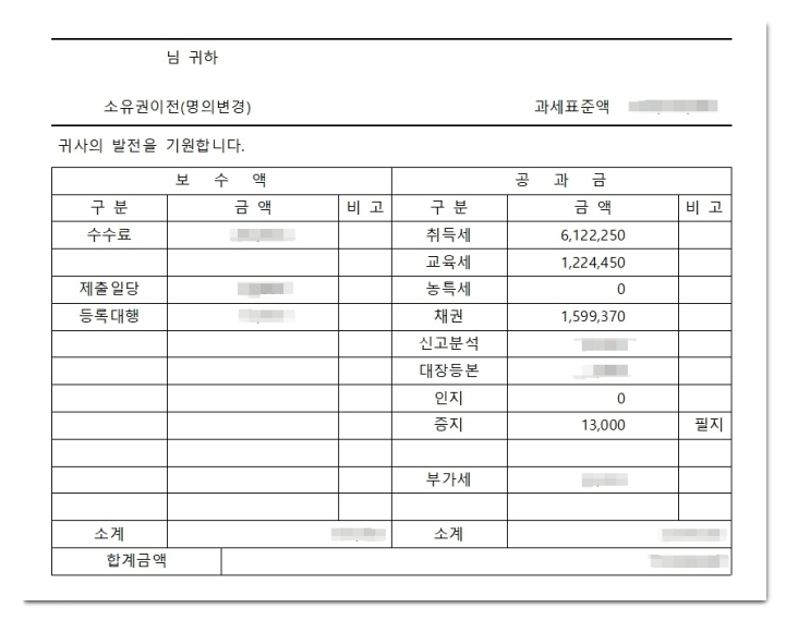 이혼재산분할취득세 포함한 등기비용 차이